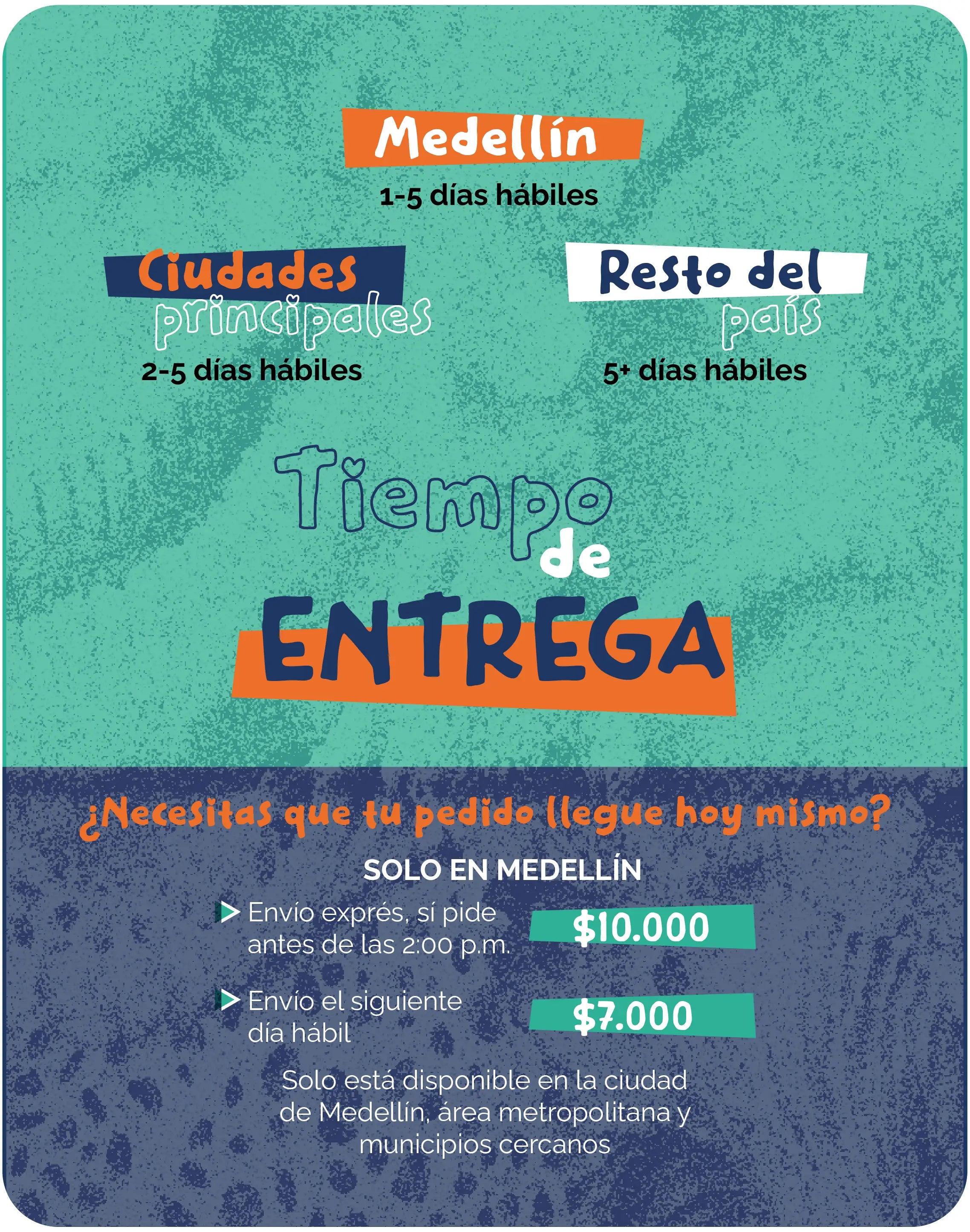 - Si te encuentras en Medellín contamos con envío exprés por un valor de ($10.000), pide antes de las 02:00 pm y te llega hoy mismo (días hábiles). También tenemos la opción de envío al día hábil siguiente por un valor de ($7.000 solo para Medellín). Elige estas opciones en la pantalla de pago.